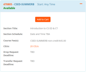 - Once you are logged in, go to our course in the course catalog: 470805 – Introduction to Computer Science Education & Computational Thinking